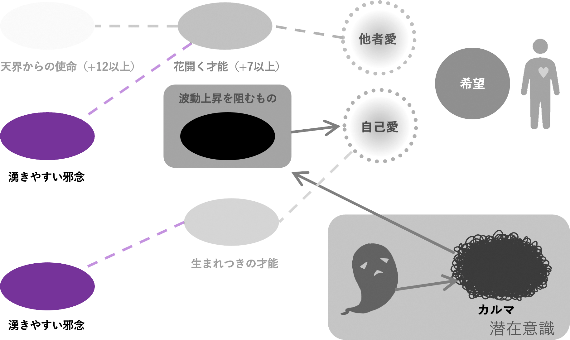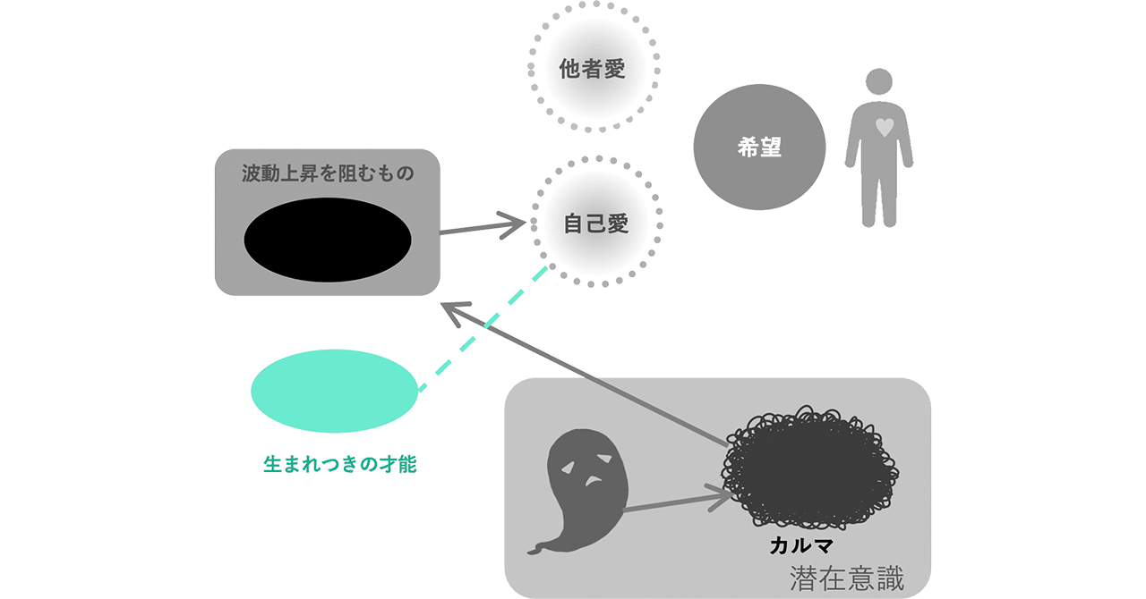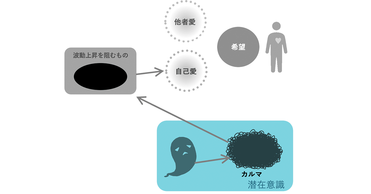 [波動上昇を阻むもの]のさらに深い原因となるカルマや潜在意識を指しています。心の奥のことですので、顕在意識では見えにくい部分です。