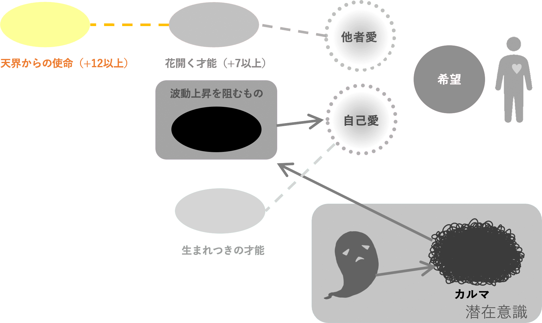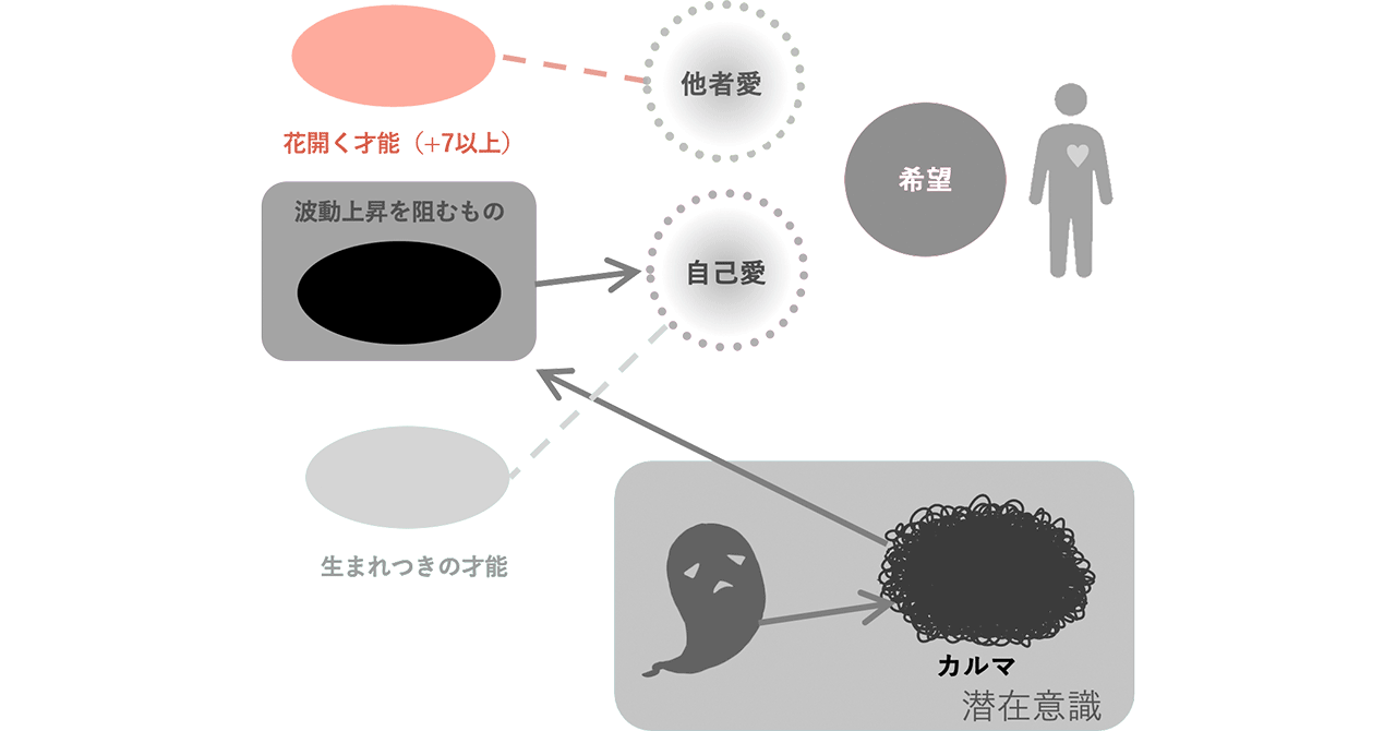いずれにせよ、[自己愛]から[他者愛]に流れるエネルギーが、このような経由によって減少してしまうために、[開花する才能]が開かれなかったり、上手に発揮できなかったりすることがあります。